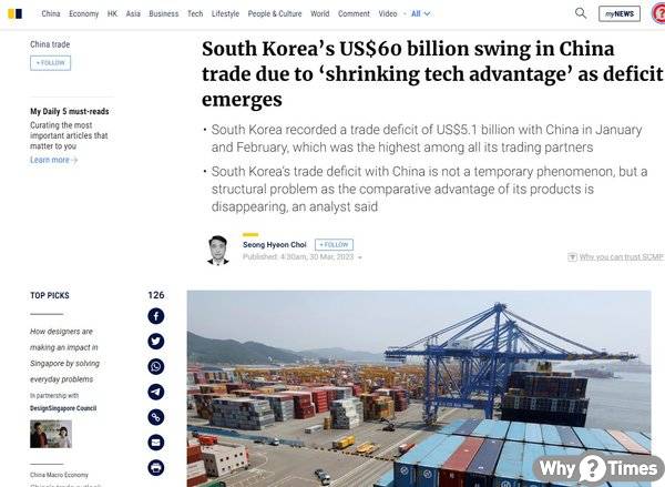 홍콩의 사우스차이나모닝포스트(SCMP)는 지난 3월 30일, “한국의 대중 무역적자는 일시적인 현상이 아니라 한국 제품의 비교우위가 사라지고 있는 구조적 문제”라면서 “(한국의) 기술 비교 우위가 줄어들수록 중국과의 적자는 더 커질 것”이라고 지적해 눈길을 끌었다.