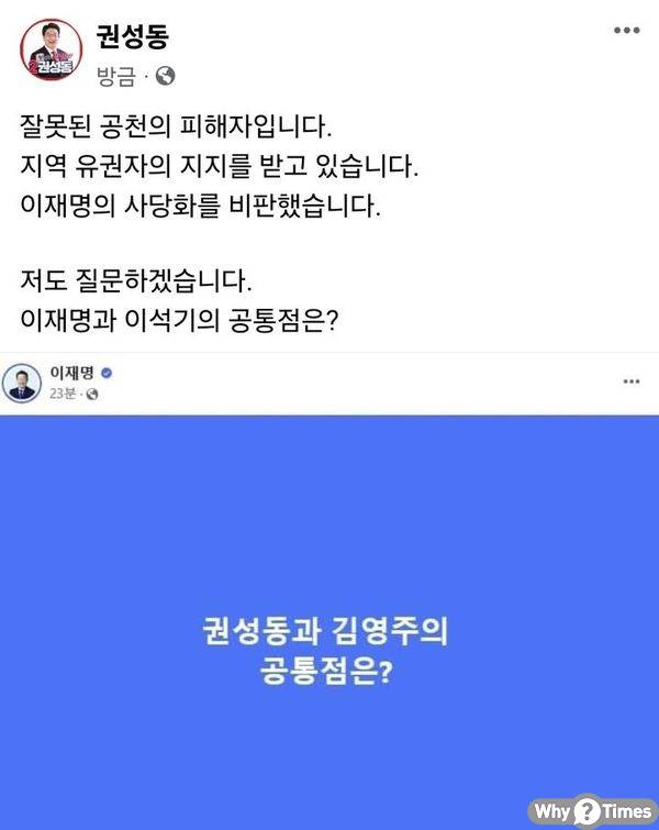 이에 권 의원은 이날 자신의 페이스북에 "(저는) 잘못된 공천의 피해자다. 지역 유권자의 지지를 받고 있다"며 "이재명의 사당화를 비판했다"고 반박했다.