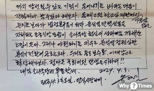 5일 송 대표가 정다은 소나무당 대변인에게 보낸 옥중 서신(4월3일 작성)에는 구치소에서 국회의원 선거를 준비하고 치르는 착잡한 심경이 담겨있다.