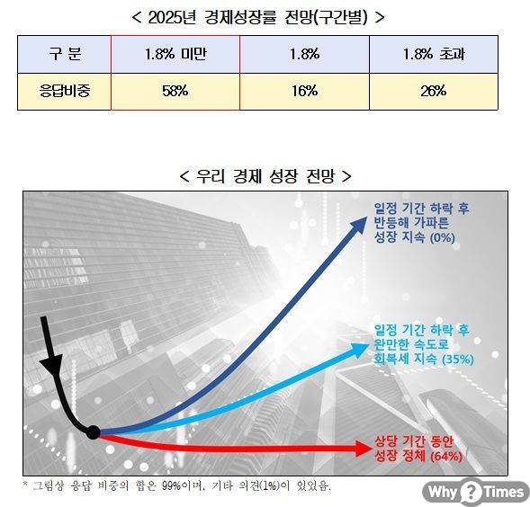 향후 우리 경제 상황에 대한 질문에서는 우리 경제가 '상당 기간 동안 성장이 정체될 것'이라는 응답이 64%로 가장 많았으며, '일정 기간 하락 후 완만한 속도로 회복세가 지속될 것'이라는 응답이 35%로 뒤를 이었다.