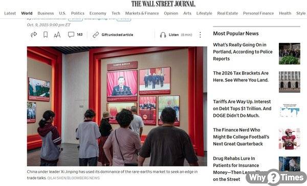 월스트리트저널(WSJ)은 10일, “중국이 희토류 원소에 대해 또다시 제한 조치를 취한 것은 전례 없는 수준의 수출 통제로, 세계 경제에 큰 혼란을 초래할 수 있으며, 베이징은 무역 협상에서 더 많은 영향력을 행사하려 하고 있다”면서 “중국 상무부가 9일 발표한 이 규정은 반도체 공급망을 위협하기 때문에 미중 무역 갈등이 심화될 것으로 예상되는데, 이는 반도체가 인공지능(AI) 모델을 훈련하는 데 필요한 휴대폰, 컴퓨터, 데이터 센터에 전력을 공급하는 경제의 핵심이기 때문”이라고 보도했다. 중국은 전 세계 희토류 원소의 약 90%를 생산한다.