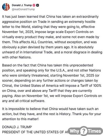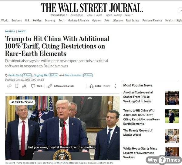 이와 관련해 월스트리트저널(WSJ)은 11일(현지시간) “트럼프 대통령은 전날 중국이 희토류 광물 수출에 광범위한 제한을 가함에 따라 중국에 100% 추가 관세를 부과하고 중요 소프트웨어 제품에 대한 새로운 수출 통제를 부과하겠다고 밝혔다”면서 “트럼프 대통령은 트루스소셜에 올린 글에서 새로운 조치가 11월 1일부터 시행될 것이며, 이는 앞서 보복 위협으로 시장 매도가 촉발되어 S&P 500 지수가 4월 이후 최악의 하루를 기록한 이후에 나온 것”이라고 전했다.