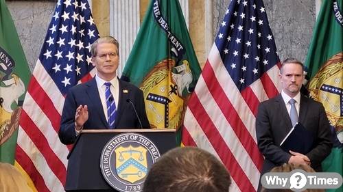 ▲ 기자회견하는 美 재무장관과 무역대표 (워싱턴=연합뉴스) 김동현 특파원 = 미국 스콧 베선트 재무부 장관과 제이미슨 그리어 미국무역대표(USTR)가 15일(현지시간) 워싱턴DC 재무부에서 기자회견을 하고 있다.